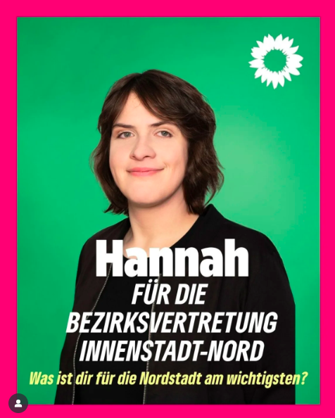 ![]() | Hallo, ich bin Sinja und lebe seit 9 Jahren in der Nordstadt. Sie ist für mich längst zur Heimat geworden. Ich will den Menschen hier zuhören und mich für ihre Anliegen stark machen. Besonders am Herzen liegt mir mehr Bildungsgerechtigkeit und soziale Chancen für alle.