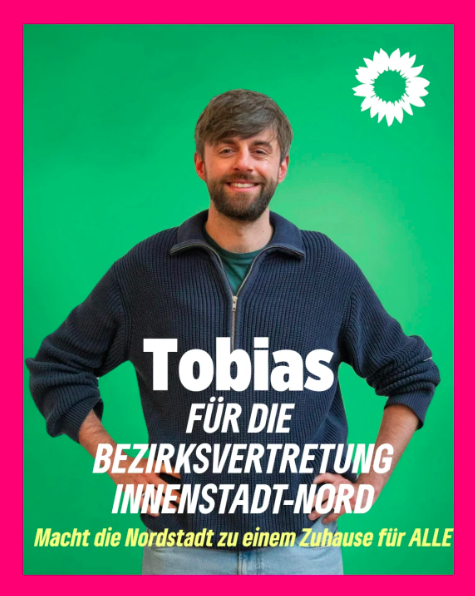 Hallo, ich bin Tobias und lebe seit 8 Jahren im Nordmarktquartier. Ich bin Stadtplaner und setze mich in der Bezirksvertretung dafür ein, dass die Nordstadt zu einem lebenswerten Ort für alle wird. Dafür müssen wir unseren öffentlichen Raum umgestalten - damit er sicher, barrierefrei und attraktiv ist.